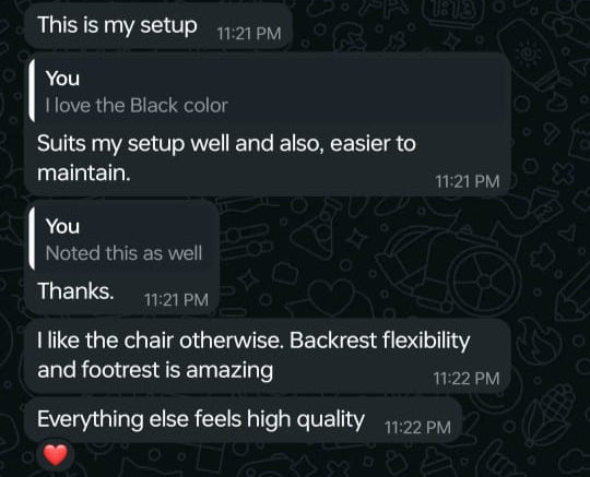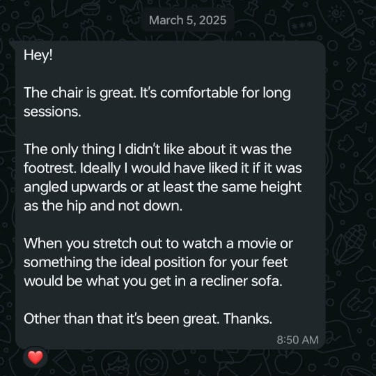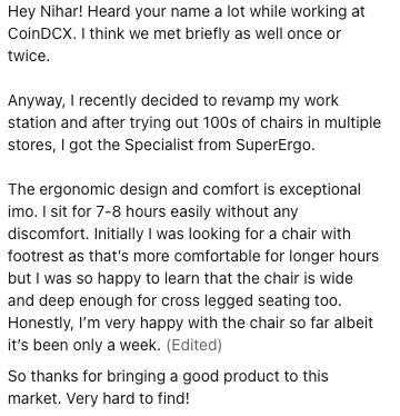 Upgraded my home office with a SuperErgo—exceptional build quality and comfort! Huge thanks to Nihar Lohiya & team for their top-notch support and commitment to customer feedback.
